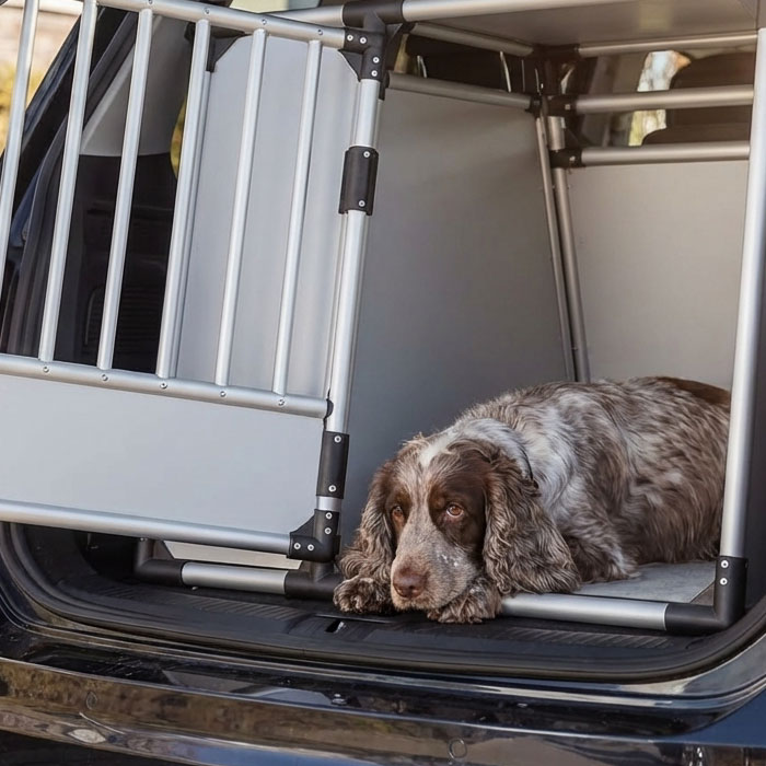 The Trixie aluminium crate is one of the most practical options for car travel in the UK. It’s designed specifically for transport, rather than being a standard crate used in a car.